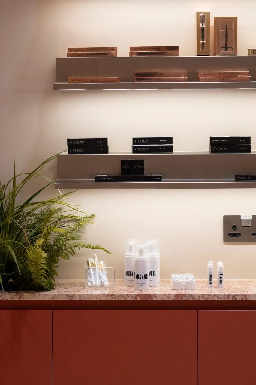 One of the project’s defining features is the multifunctional architectural wall. Acting simultaneously as a statement entry, retail display, and brow bar, it encapsulates the project’s central design narrative: simplicity elevated through sculptural precision. Its organic geometry, paired with a play of matte and glossy finishes, adds dynamism while grounding the space in Brau’s aesthetic DNA.