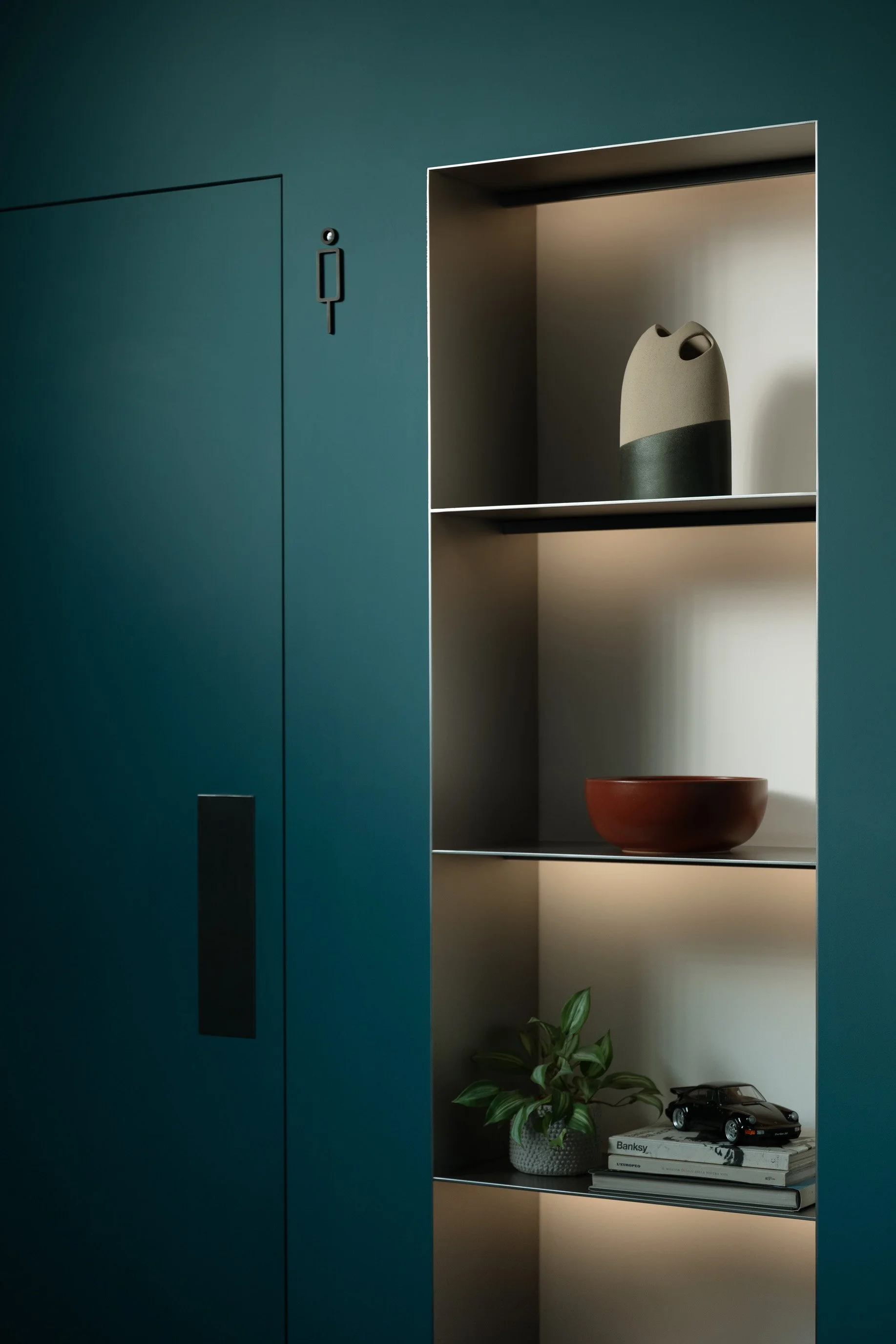 Brushed metal accents punctuate the space, reflecting light while adding a subtle industrial edge.